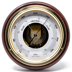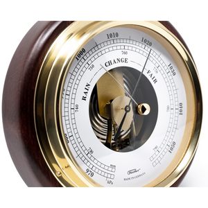 This beautiful mahogany and brass barometer and Tide Clock has a modern feel. It has been lovingly engineered to perfection in Germany by Fischer. The face clearly indicates which direction the weather is going to go on any given day, from rain to shine, depending on the barometric pressure in the air.